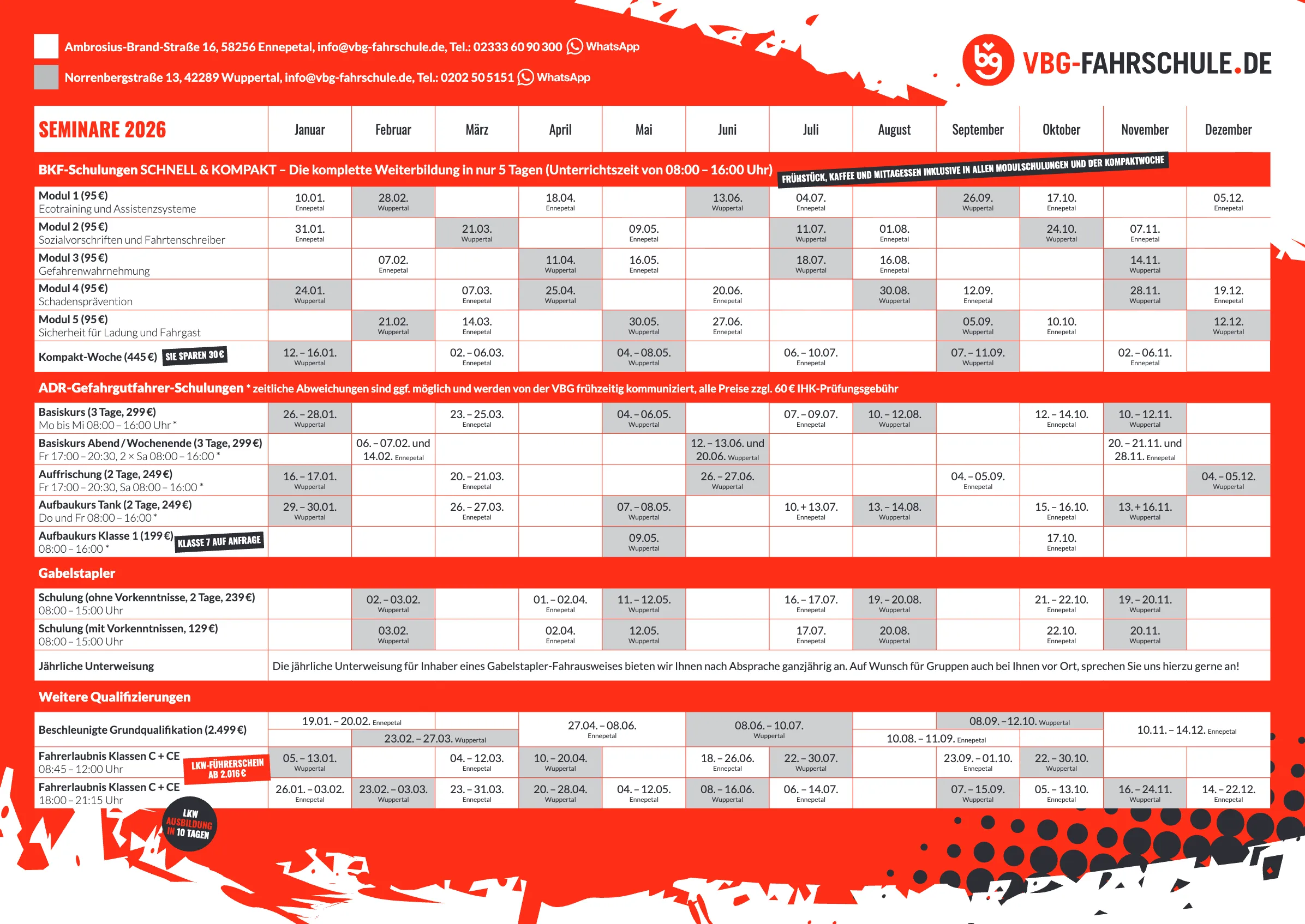Im Seminarplan 2026 findest Du erneut alle Weiterbildungen, die Dich beruflich voranbringen. Unser Angebot deckt die komplette Qualifizierung für Berufskraftfahrer*innen ab – von der beschleunigten Grundqualifikation (Schlüsselzahl 95) bis hin zu den regelmäßigen Modulen, die Du für den langfristigen Erhalt Deiner Qualifikation benötigst. Zusätzlich kannst Du 2026 wieder spezielle Schulungen wie ADR-Gefahrgut oder den Gabelstapler-Schein einplanen, damit Du Deine beruflichen Möglichkeiten weiter ausbaust.